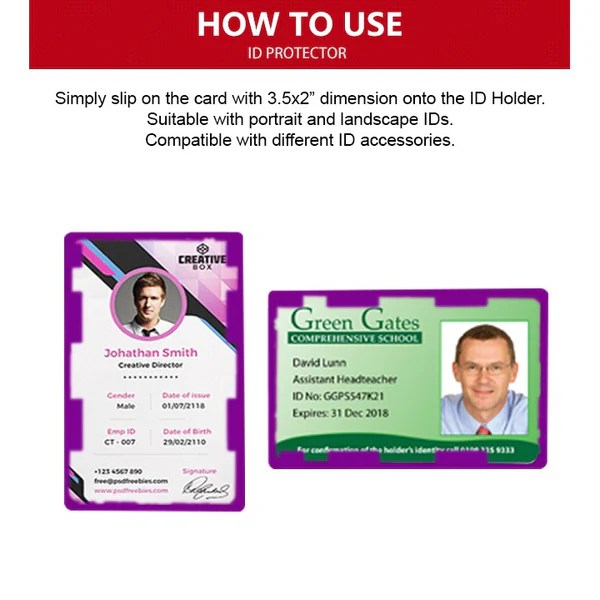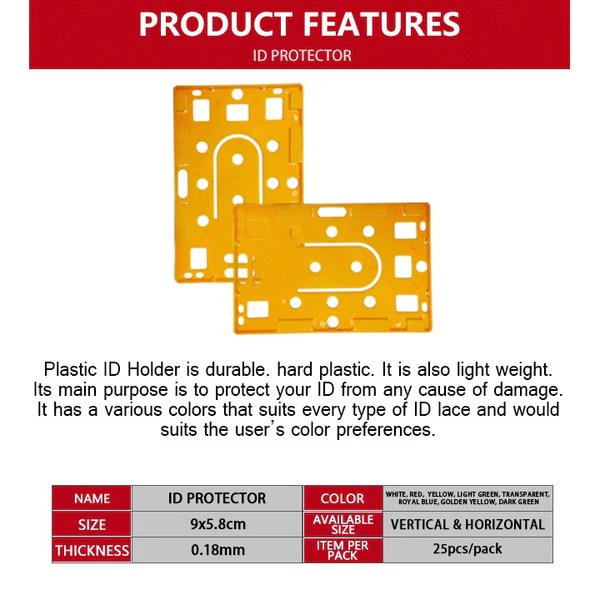 Plastic ID Holder is durable, hard plastic. It is also lightweight. Its main purpose is to protect your ID from any cause of damage. It has various colors that suit every type of ID lace and would suit the user’s color preferences. Can be used vertically or horizontally.