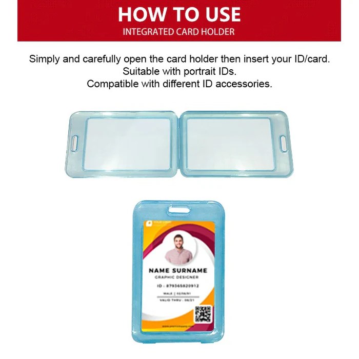 Integrated PP cardholder is durable, hard plastic. It is also lightweight. Front and back seethrough. Its main purpose is to protect your ID from any cause of damage. It has various colors that suit every type of ID lace and would suit the user’s color preferences. Simply and carefully open the cardholder then insert your ID/card. Suitable with portrait IDs. Compatible with different ID accessories.
